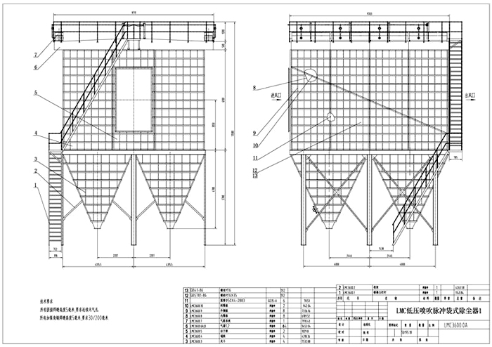 (1)鑄造廠電爐布袋除塵器 結(jié)構(gòu) 點(diǎn) 除塵器中部箱體為園形筒狀結(jié)構(gòu),設(shè)計(jì)壓力0.25MPa,材質(zhì)為Q345R,板厚14mm以上。其上設(shè): 檢修人孔。 箱體設(shè)氮?dú)獯祾呦到y(tǒng),用于qingchu積聚的灰塵和筒體煤氣置換吹掃; 高爐布袋除塵器 高爐布袋除塵器(2張) 儀表壓縮空氣系統(tǒng),用于閥門控制;設(shè)人工灰塵檢測(cè)口,方便取樣化驗(yàn)。 懸掛式箱體支座。煤氣進(jìn)口接管設(shè)相應(yīng)導(dǎo)流配氣裝置。 高爐布袋除塵器頂部采用符合/T4746-2002標(biāo)準(zhǔn)要求的正橢圓形封頭,壁厚16mm以上,材質(zhì)Q345R。凈煤氣從箱體頂部接出,在封頭上設(shè)有anquan閥及放散管。 高爐布袋除塵器下部采用錐形灰斗,材質(zhì)Q345R,板厚14mm以上,錐形灰斗錐角為50°,確保灰塵順利排出。下錐體上設(shè)雙路蒸汽保溫盤管防止煤氣結(jié)露和粉塵結(jié)塊而影響排灰。灰斗上下高低灰位各設(shè)一個(gè)熱電阻檢測(cè)灰斗的灰位,并設(shè)有倉(cāng)壁震動(dòng)器兩套和氮?dú)獯祾吖堋?除塵器進(jìn)、出口管道分別設(shè)置全封閉式電動(dòng)插板閥、氣動(dòng)三偏心蝶閥、大拉桿波紋補(bǔ)償器、手孔。